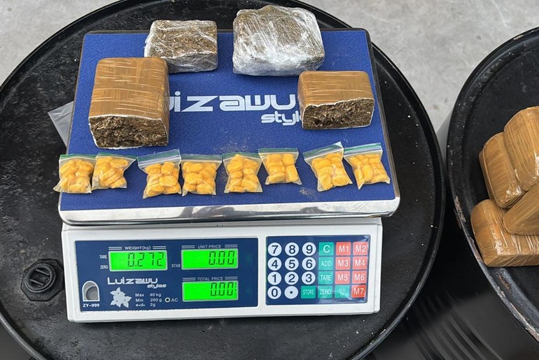 Na casa, foram apreendidos aproximadamente 33,5 quilos de maconha, 62 gramas de comprimidos semelhantes a ecstasy e três balanças de precisão, que, segundo a polícia, eram utilizadas para pesar e fracionar o entorpecente.